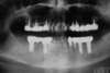 Extraction d'un bloc inscisif maxillaire naturel, pose de 10 implants complémentaires à ceux existants postérieurs (technique de "Summers") et réalisation d'un bridge complet maxillaire céramique sur implant fixe.